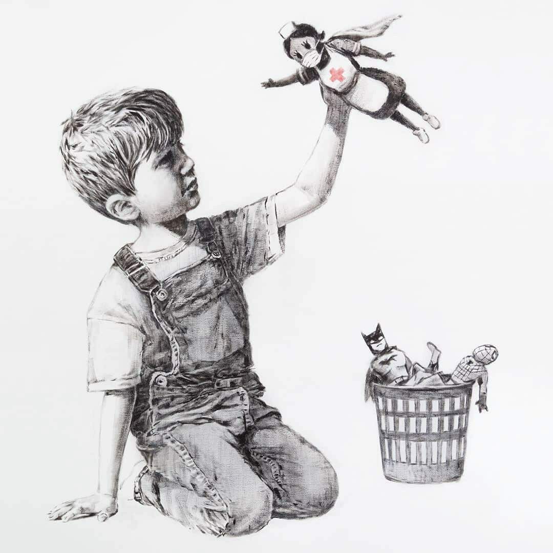 A criação em preto e branco do famoso artista urbano representa um menino de joelhos, brincando com uma boneca super-heroína: uma enfermeira com capa, máscara e um avental com uma cruz vermelha. No lixo, perto do menino, estão os bonecos do Batman e Homem-Aranha, abandonados.