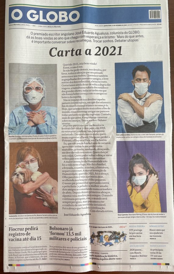 José Eduardo Agualusa (Jornal O Globo, capa, 31 de dezembro de 2020)