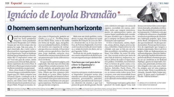 Quando me perguntam: o que você leu nesta pandemia? Pergunto: nesta pandemia? Existe outra? Respondo. Ler? A Malu Gaspar por um bom tempo não me deixou ler nada. Não teve jeito. Fiquei encerrado, dia e noite, noite e dia em um livro-reportagem intitulado A Organização. Vocês se lembram da frase que acompanhava o chocolatinho Bis? É impossível comer um só? Você não para de comer. Assim acontece com o livro de Malu, das melhores repórteres da revista Piauí. E do Brasil, e olhem que estamos tendo mulheres jornalistas excepcionais!