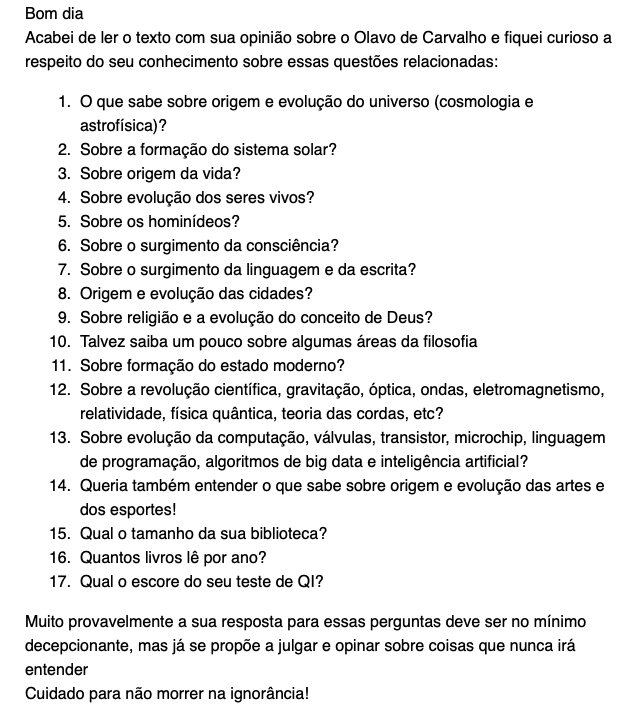 Entro no meu e-mail hoje e me deparo com esta mensagem. Sem dúvida alguma, a melhor que recebi sobre o fio anterior: