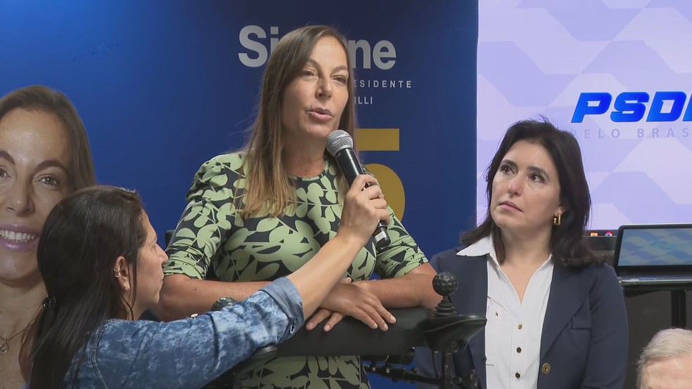 A senadora Mara Gabrilli (PSDB) discurso no evento que foi indicada vice na chapa de Simone Tebet (MDB). — Foto: Reprodução/TV Globo