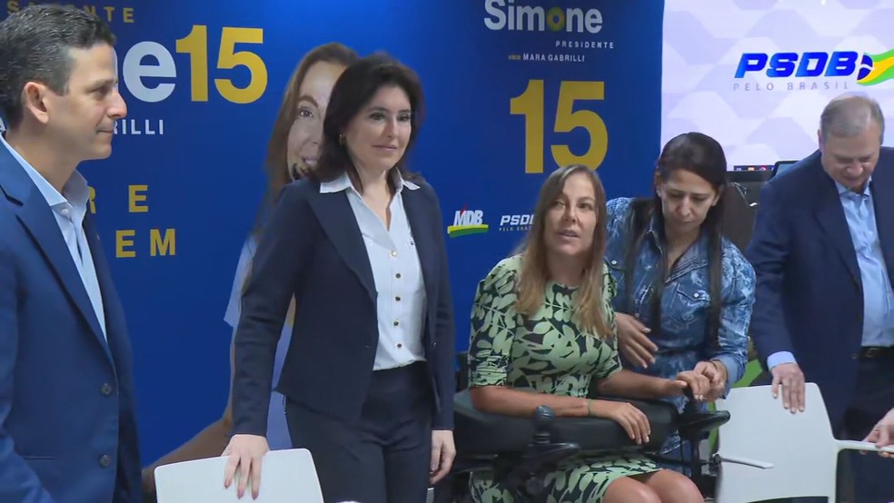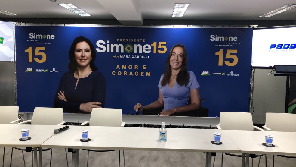Painel de coletiva do PSDB anuncia a senadora Mara Gabrilli como vice de Simone Tebet (MDB) na chapa que concorre à Presidência da República. — Foto: Phillipe Guedes/TV Globo