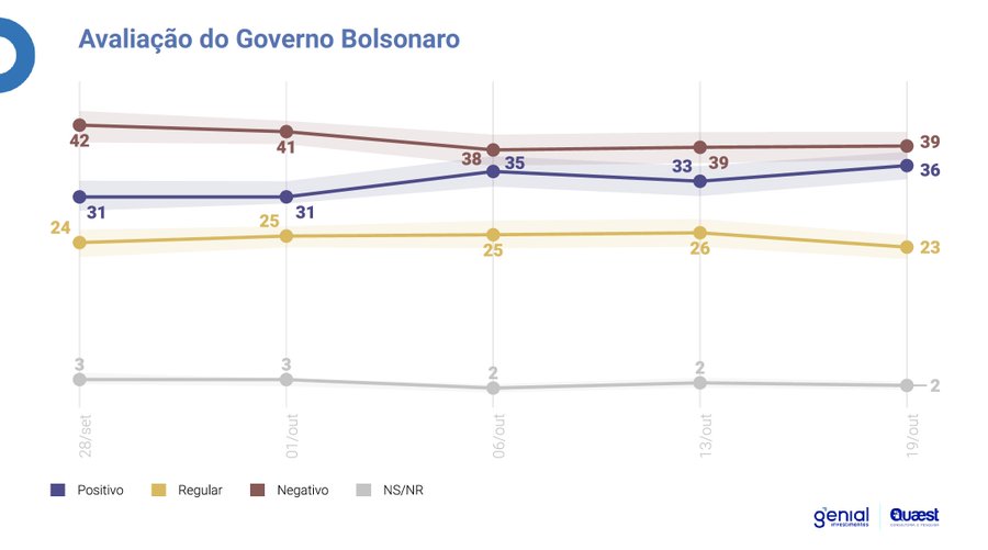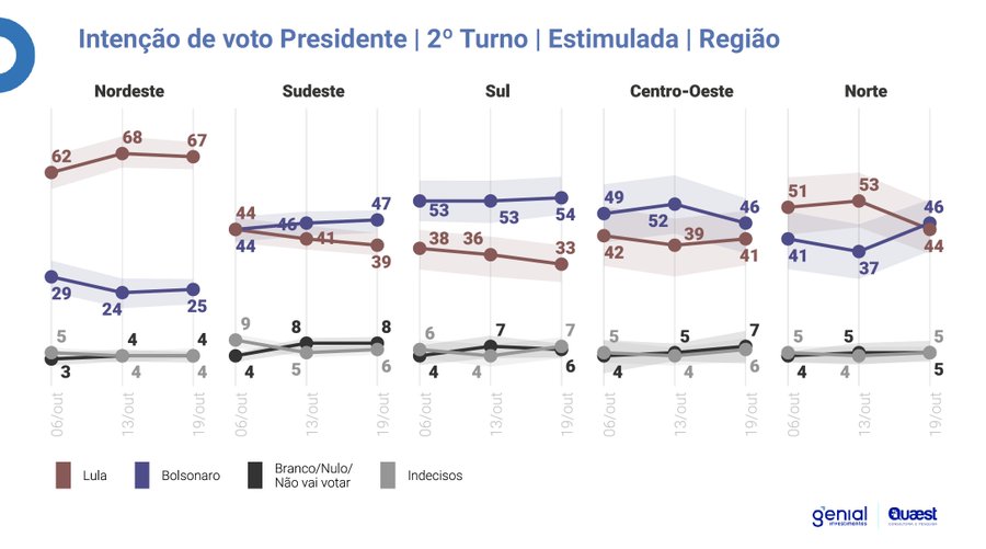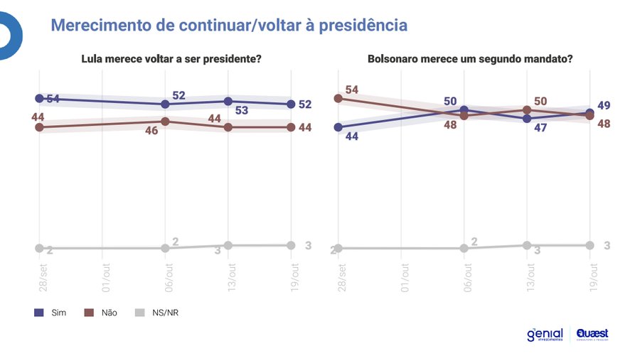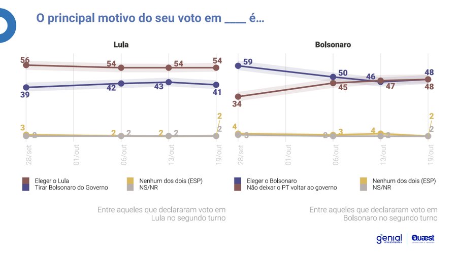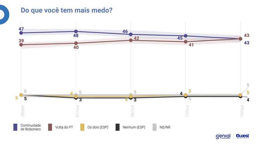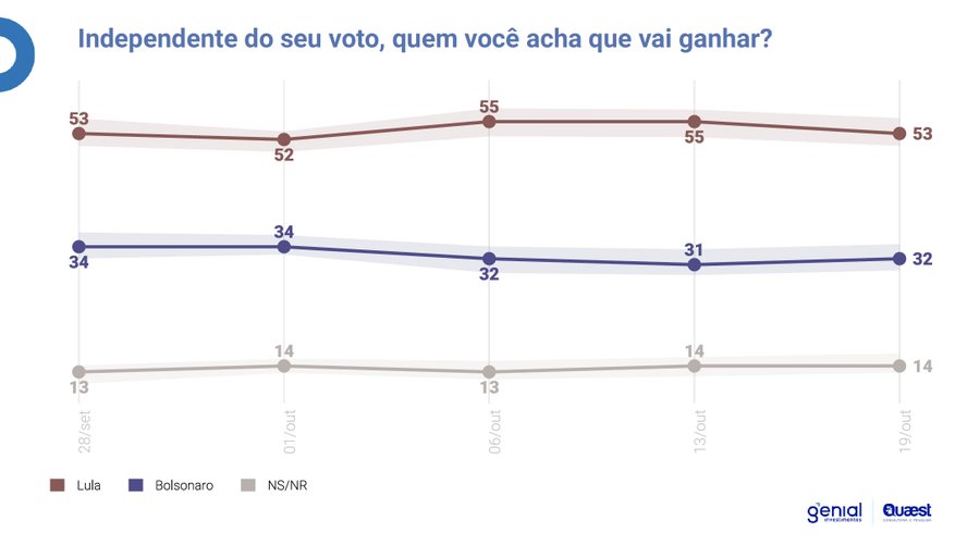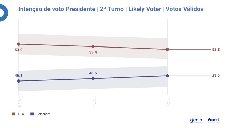 1/ A onze dias da eleição, pesquisa Genial/Quaest mostra que a distância entre Lula e Bolsonaro sai de 8 para 5 pontos percentuais. Lula aparece com 47% das intenções de voto totais (entre 45% e 49%), enquanto Bolsonaro tem 42% dos votos totais (entre 40% e 44%).