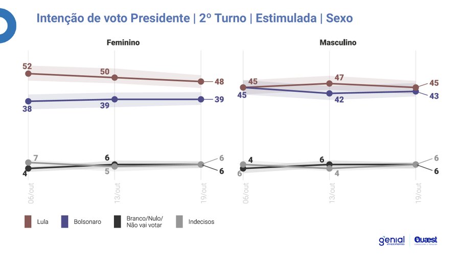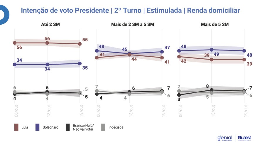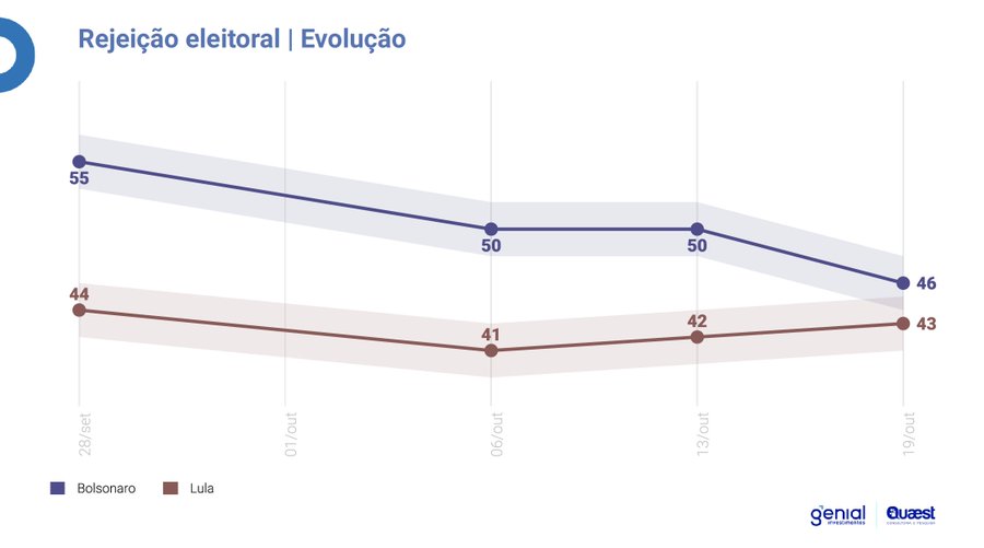 O comentário é de quem entende de marketing eleitoral, Luiz Gonzales, veterano de campanhas do PSDB: “Eu acho que a estratégia da campanha Bolsonaro de rolar na lama emparedou a campanha de Lula. Atacada com tantas barbaridades, a campanha de Lula ataca igual. Mas já está tudo na conta. Ninguém subiu. Mas Lula não projeta esperança e, com isso, não captura votos dos eleitores sem preferência partidária e sem rejeição brutal ao Bolsonaro”. O diagnóstico é compartilhado por aliados de Luiz Inácio Lula da Silva (PT) não petistas, apreensivos, principalmente, com a situação eleitoral de São Paulo, onde uma vantagem de 10% dos votos a favor do presidente Jair Bolsonaro pode leva-lo à reeleição.