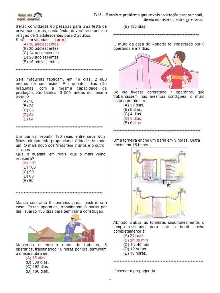 D15-Resolver Problema Que Envolva Variações Proporcionais, Diretas Ou Inversas Entre Grandezas.
