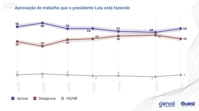 1/ Pesquisa Genial/Quaest publicada hoje mostra que aprovação do governo Lula atinge 54% e a desaprovação passa para 43%. Este é o melhor resultado de aprovação do governo no ano, idêntico ao que se observava em dez/23.