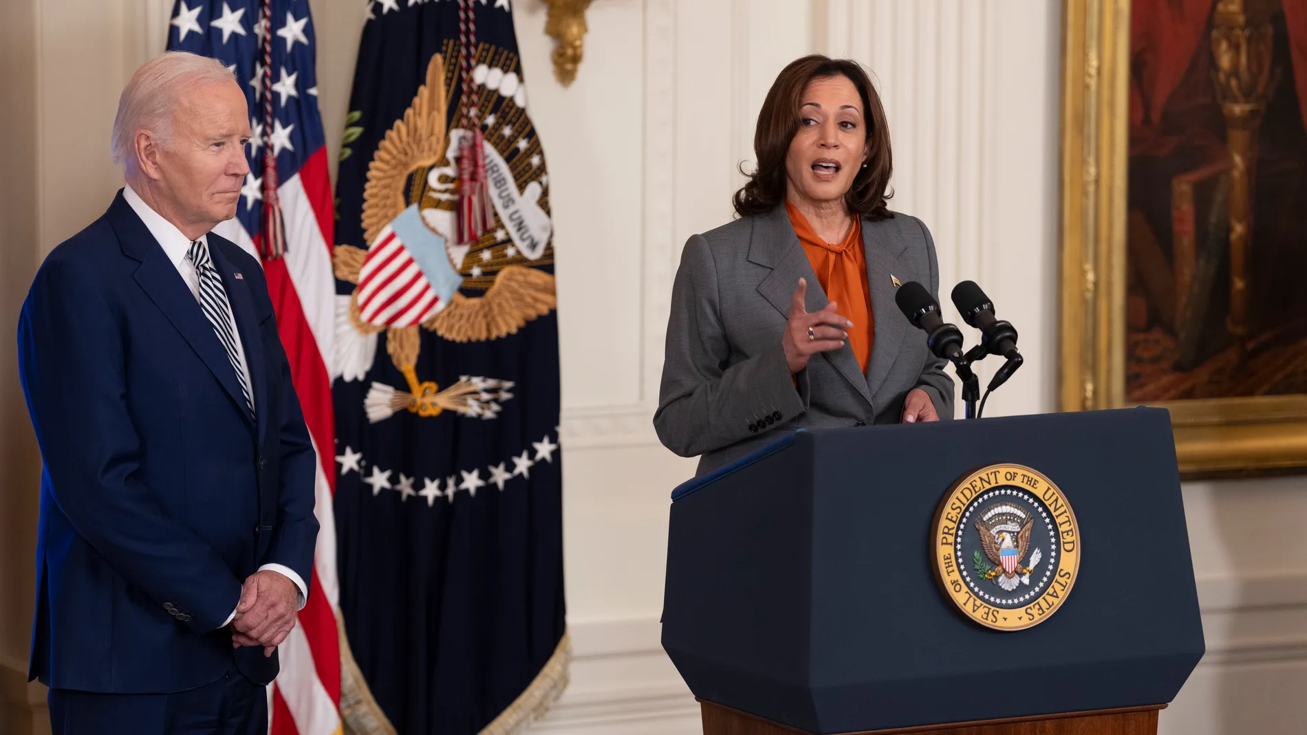 (A imprensa está reunida. Biden e Kamala estão no palco.)