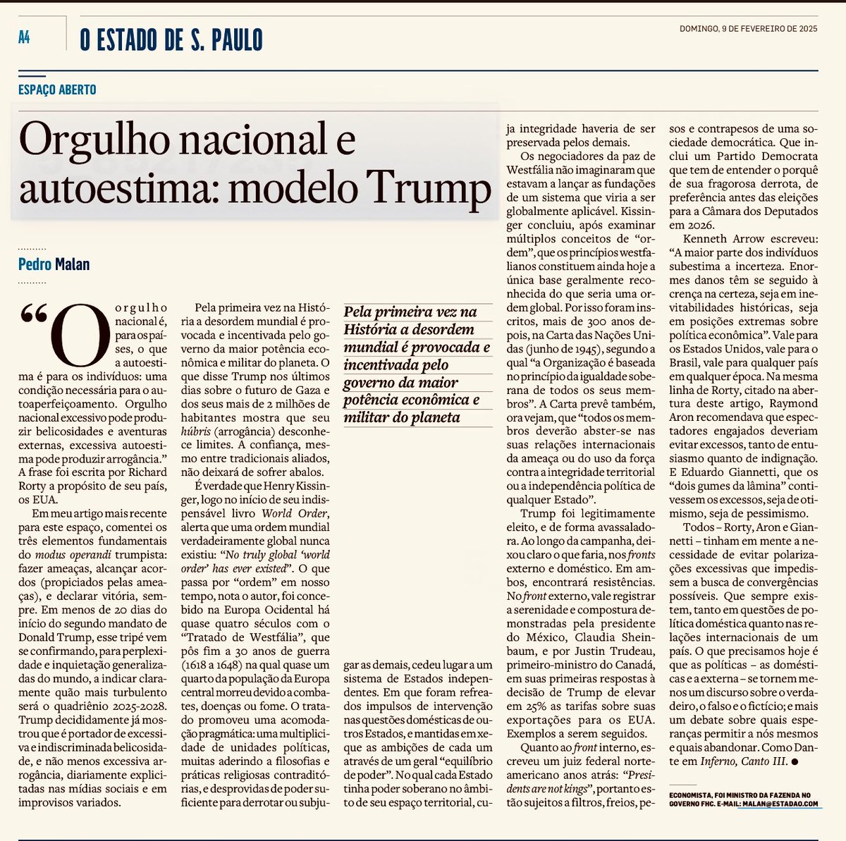 Orgulho nacional e autoestima: modelo Trump - Pedro Malan