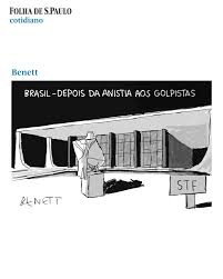 #PraTodosVerem: Charge de Benett publicada na Folha em 15 de abril de 2025 tem o título "BRASIL - DEPOIS DA ANISTIA AOS GOLPISTAS". A ilustração mostra o prédio do STF, de arquitetura moderna com colunas verticais e uma estrutura horizontal superior. O céu está escuro, sombrio. Em primeiro plano, sobre um pedestal retangular, no lugar da famosa estátua da Justiça , há uma escultura da golpista "Fátima de Tubarão", na posição que a tornou célebre no dia 8 de janeiro de 2023.