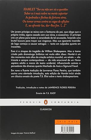 Neste clássico da literatura mundial, um jovem príncipe se reúne com o fantasma de seu pai, que alega que seu próprio irmão, agora casado com sua viúva, o assassinou. O príncipe cria um plano para testar a veracidade de tal acusação, forjando uma brutal loucura para traçar sua vingança. Mas sua aparente insanidade logo começa a causar estragos - para culpados e inocentes. Esta é a sinopse da tragédia de Shakespeare, agora em nova e fluente tradução de Lawrence Flores Pereira, que também oferece uma alentada introdução à obra. A edição traz ainda um clássico ensaio do poeta T.S. Eliot sobre o texto shakespeariano. Hamlet é um dos momentos mais altos da criação artística, um retrato - eletrizante e sempre contemporâneo - da complexa vida emocional de um ser humano.