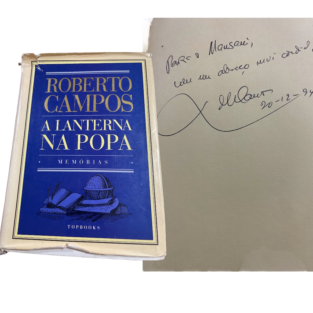LIVRO AUTOGRAFADO / CAMPOS, ROBERTO. A LANTERNA NA POPA. Rio de Janeiro: TopBooks, 1994. 1ª EDIÇÃO. COM DEDICATÓRIA E AUTÓGRAFO DO AUTOR: PARA O MANSANI, COM UM ABRAÇO MUI CORDIAL DO ROBERTO CAMPOS. 20/12/1994. Livro em bom estado de conservação e pontuais desgates; capa dura com sobrecapa; sobrecapa apresenta amassados e pequenos rasgos na parte superior. 1417p.*Roberto de Oliveira Campos ABL (Cuiabá, 17 de abril de 1917 Rio de Janeiro, 9 de outubro de 2001) foi um economista, professor, escritor, diplomata e político brasileiro. Nascido em Mato Grosso, oriundo de uma família de origem humilde, formou-se em Filosofia e Teologia em um seminário católico, seguindo a carreira diplomática após passar no concurso do Itamaraty. 1 Foi nomeado cônsul de terceira classe em Washington, e, nesta cidade, se formou em Economia pela Universidade George Washington. Pouco tempo depois, foi promovido a cônsul de segunda classe, e foi designado segundo secretário de Washington. Fez parte da delegação brasileira da Conferência de Bretton Woods, que criou o Fundo Monetário Internacional e o Banco Mundial. Após isso, juntou-se à representação do Brasil nas Nações Unidas em Nova Iorque, onde fez a sua Pós-Graduação em Economia pela Universidade de Colúmbia. No período em que permaneceu nos Estados Unidos, foi membro da delegação brasileira em diversas reuniões e conferências internacionais. Mais tarde, tornou-se parte da assessoria econômica do presidente Getúlio Vargas, sendo um dos idealizadores da Petrobras, autarquia que havia sido inicialmente pensada como empresa mista sob controle majoritário do Estado ao invés de um monopólio estatal. No Governo Juscelino Kubitschek, foi um dos Presidentes do Banco Nacional de Desenvolvimento Econômico e Social e teve uma participação importante no Plano de Metas. Após o Golpe de Estado de 1964, foi ministro do Planejamento durante o governo de Castelo Branco, quando promoveu muitas reformas econômicas. Foi um dos idealizadores do BNDES, Banco Central do Brasil, Estatuto da Terra e do FGTS. Em 1982, foi eleito senador pelo seu estado natal, Mato Grosso. Em 1990, ao invés de disputar a reeleição como senador, preferiu se candidatar a deputado federal pelo Rio de Janeiro, tendo sido eleito naquele ano e reeleito em 1994.3 Em 1998, Campos disputou as eleições por uma cadeira no Senado Federal, também pelo Rio de Janeiro, mas Sartunino Braga ficou à frente na disputa por uma diferença de 5% dos votos. Em 23 de Setembro de 1999, foi eleito imortal pela Academia Brasileira de Letras. Faleceu de um infarto agudo do miocárdio no dia 9 de outubro de 2001, no Rio de Janeiro.