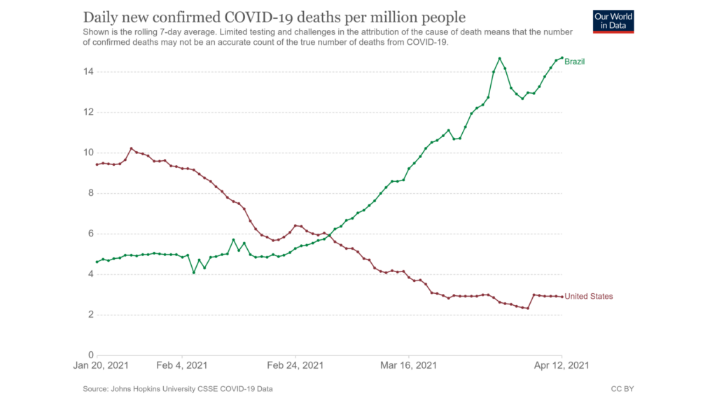 Naquele dia, os Estados Unidos apresentavam a marca de 8,31 mortes por dia por milhão de habitante em média semanal. Esse índice era mais do que o dobro do apresentado pelo Brasil, que registrava 3,60 mortes, de acordo com o mesmo critério. A sequência inicial evolui, com as curvas tendendo a se inverter e no dia 2 de março os valores se igualam em 5,93 óbitos. A partir de então, as estatísticas brasileiras refletem a explosão descontrolada de casos fatais, ao passo em que a estratégia norte-americana de vacinação e medidas de precaução e isolamento parecem surtir efeito. Em 2 de abril o Brasil atinge a marca de 14,70 mortes, enquanto os EUA reduzem a média diária para 2,91. Ou seja, em menos de três meses aumentamos em mais de 300% os óbitos, enquanto os norte-americanos viram as mortes serem reduzidas em 65%.