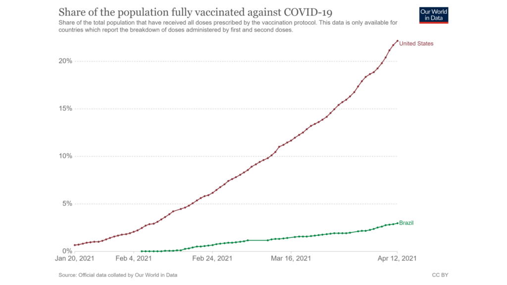 Outra iniciativa relevante foi o estímulo à vacinação em massa. O gráfico 2 abaixo nos mostra a evolução da porcentagem da população que está definitivamente imunizada. No início do governo Biden, a taxa era apenas de 0,65% e o Brasil nem havia começado sua campanha. Atualmente, menos de 3 meses depois, os Estados Unidos atingiram a marca de 22% da população plenamente vacinada e o Brasil está em 3% apenas.