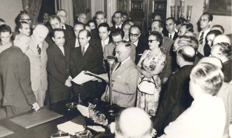 Getúlio discursa, observado por Café Filho (atrás dele) e pelo deputado Tancredo Neves (à direita de Café) durante solenidade de assinatura do decreto de criação da Petrobrás