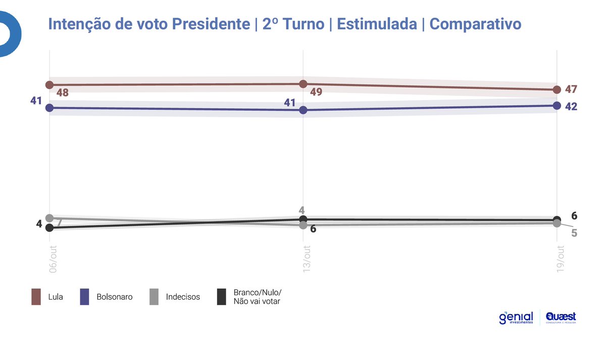 1/ A onze dias da eleição, pesquisa Genial/Quaest mostra que a distância entre Lula e Bolsonaro sai de 8 para 5 pontos percentuais. Lula aparece com 47% das intenções de voto totais (entre 45% e 49%), enquanto Bolsonaro tem 42% dos votos totais (entre 40% e 44%).